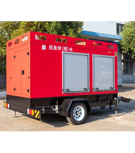 可根據用戶提出的總流量和揚程要求,選擇四輪(lún)移動式拖車底盤,配套相應水泵功率(15kW、18.5kW、22kW、30kW、45KW)和柴油發(fā)電機組功率。